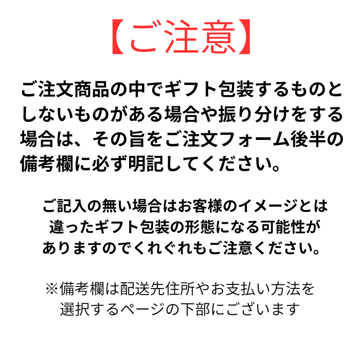 ご注文商品の中でギフト包装するものとしないものがあったり、振り分ける場合は、備考欄に必ず明記してください。